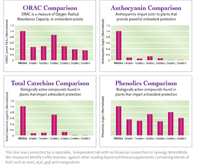Důkazy o účinnosti tohoto prvotřídního složení byly publikovány nezávislou laboratoří, která není žádným způsobem spojena se Synergy WorldWide. Bylo provedeno porovnání přípravku Mistify s nejlepšími produkty ve stejné kategorii a ukázalo se, že Mistify poráží konkurenci co do kapacity absorbovat volné radikály kyslíku, obsahu katechinů, antokyanů a fenolických sloučenin. Přesvědčte se sami: