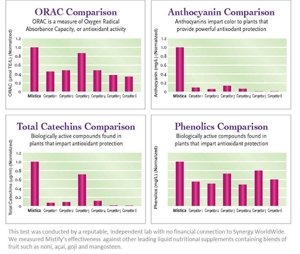 Důkazy o účinnosti tohoto prvotřídního složení byly publikovány nezávislou laboratoří, která není žádným způsobem spojena se Synergy WorldWide. Bylo provedeno porovnání přípravku Mistify s nejlepšími produkty ve stejné kategorii a ukázalo se, že Mistify poráží konkurenci co do kapacity absorbovat volné radikály kyslíku, obsahu katechinů, antokyanů a fenolických sloučenin. Přesvědčte se sami: